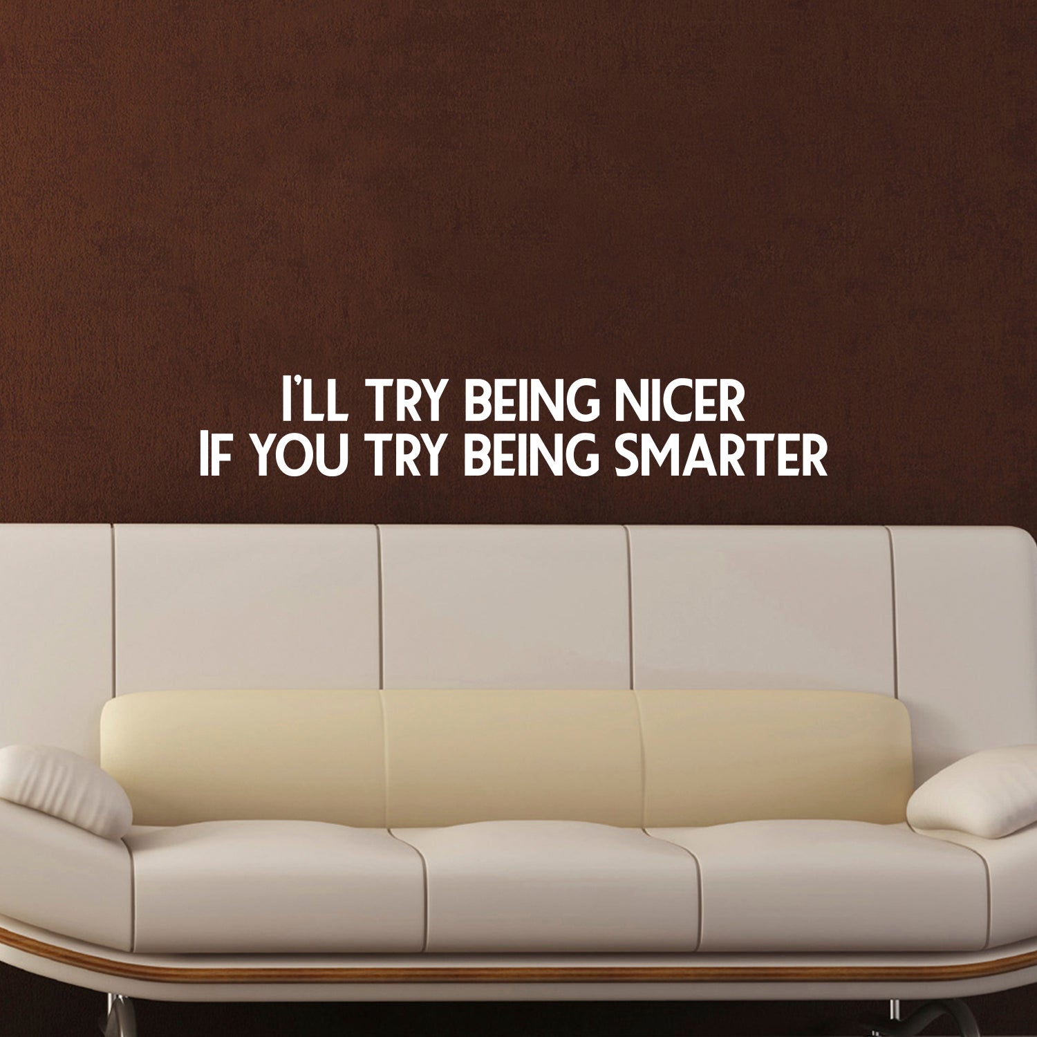 Vinyl Wall Art Decal - I'll Try Being Nicer If You Try Being Smarter - 5" x 31" - Funny Inspirational Quote - Home Decor for Living Room Bedroom Office Business Workplace Sticker Decals (White) 660078112878