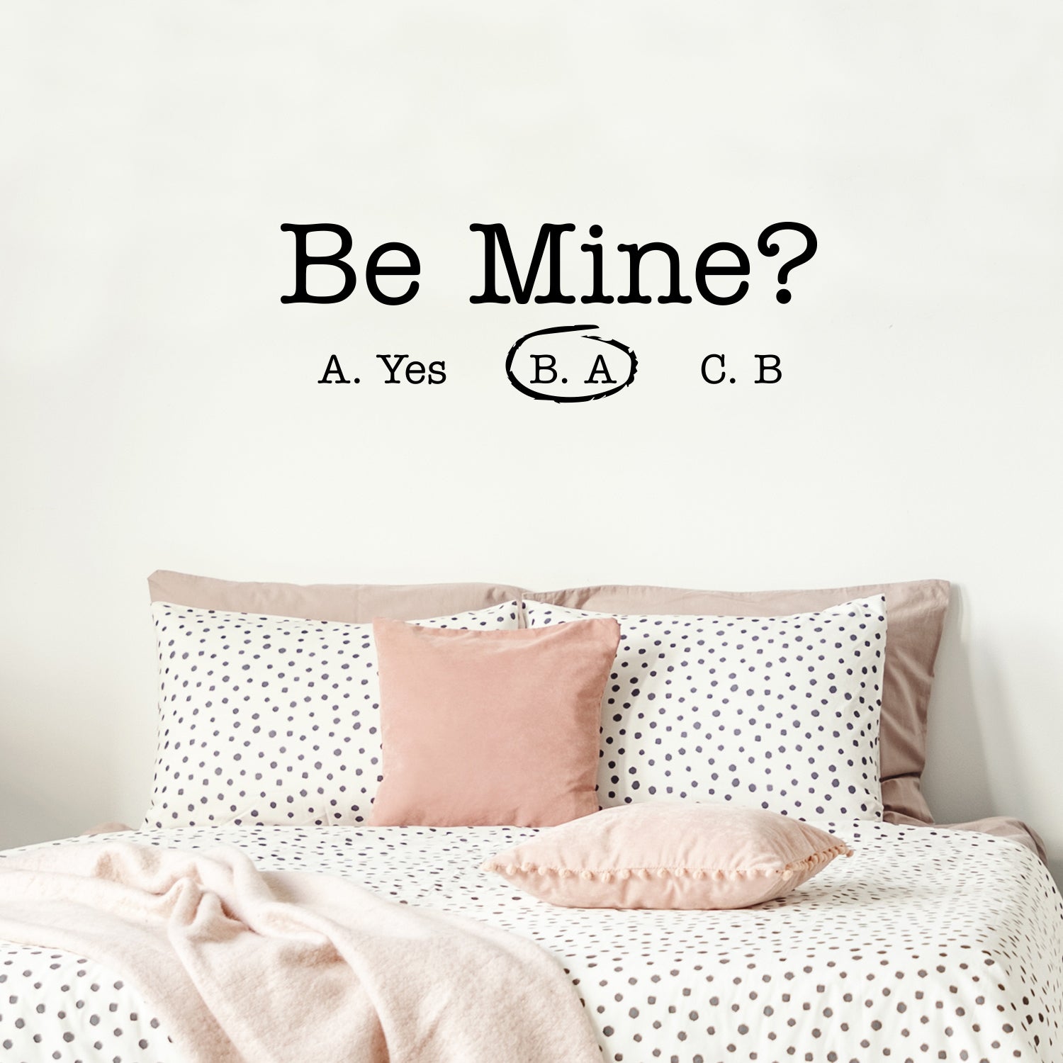 This modern "Be Mine A. Yes B. A C. B" wall art decal is modern and the perfect touch for both indoor and outdoor decoration. It's a vinyl sticker that is easy to put on almost any smooth surface and really brings a room together adding the perfect touch of decoration. This vinyl decal quote is perfect for Valentine's day or any time of year to bring charm wherever you decide to put it. Our modern quotes don't just brighten up the room, but brighten up the day. Using top of the line vinyl across all of our production allows us to be the leaders in quality and design.