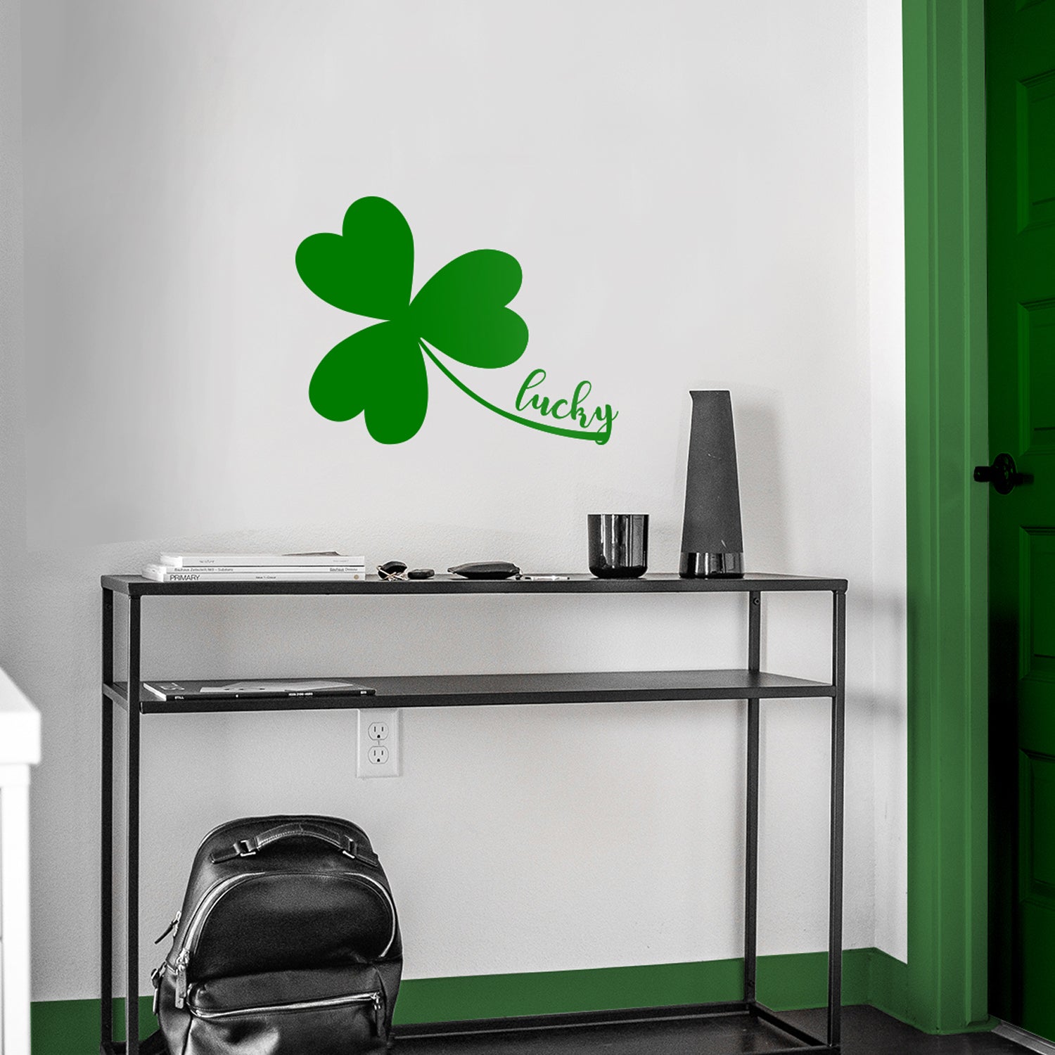 St Patrick's Day Vinyl Wall Art Decal - 3 Leaf Clover Lucky Cursive - 17" x 22.5" - St Patty's Holiday Modern Coffee Shop Home Living Room Bedroom Apartment Office Work Decor (17" x 22.5", Green) 660078138113